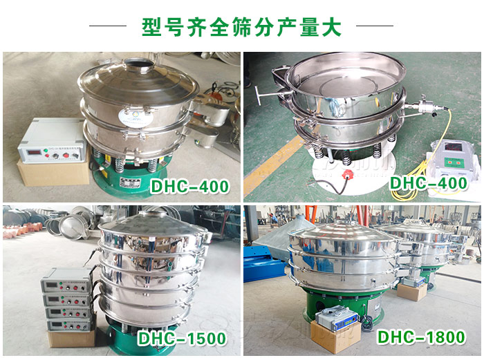 超聲波旋振篩型號(hào)齊全產(chǎn)量大,型號(hào)有DHC-400、DHC-600、DHC-800、DHC-1000、DHC-1200、DHC-1500、DHC-1800、DHC-2000等,材質(zhì)可選擇不銹鋼、碳鋼材質(zhì)。還可根據(jù)不同需求特殊定制(加高加緣、安裝進(jìn)料斗等)。相同型號(hào)產(chǎn)量比普通旋振篩產(chǎn)高10-15倍。