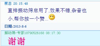 您好,得知您購(gòu)買(mǎi)我們的ZPS-800型直排篩現(xiàn)已投入到生產(chǎn)中,并且效果很好,雜音也很小,為此向你祝賀。我們大漢公司生產(chǎn)的一系列振動(dòng)篩,振動(dòng)振動(dòng)篩,直排篩,試驗(yàn)篩,拍擊篩,氣流篩因做工扎實(shí),質(zhì)量可靠而受到廣大客戶的稱贊。
