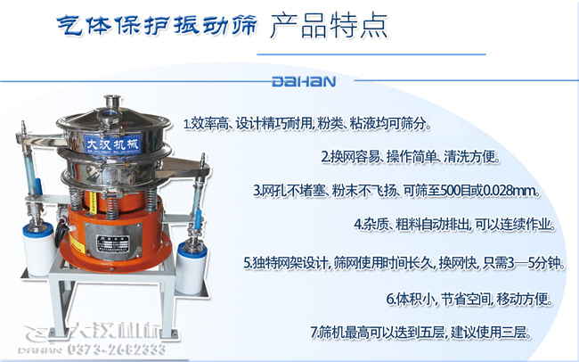 氣體保護(hù)篩分機(jī)采用304不銹鋼材質(zhì),氣體保護(hù)軟管,防靜電裝置等制作而成。氣體保護(hù)篩分機(jī)型號(hào)是從φ400-φ1800mm直徑,氣體保護(hù)篩分機(jī)價(jià)格根據(jù)材質(zhì)和直徑大小、層數(shù)價(jià)格不同。
